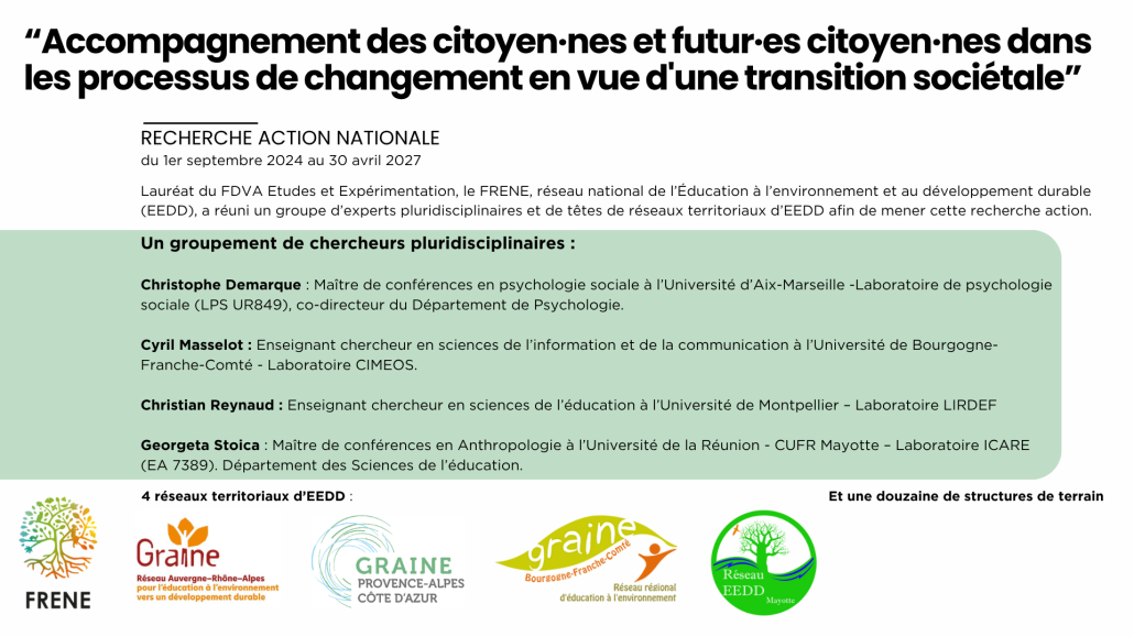 Les réseaux territoriaux partenaires – le GRAINE Auvergne-Rhône-Alpes, le GRAINE Bourgogne-Franche-Comté, le GRAINE Provence-Alpes-Côte d’Azur et le Réseau EEDD 976 (Mayotte) – seront au cœur du déploiement de cette recherche-action, en lien direct avec le FRENE et les équipes scientifiques associées.