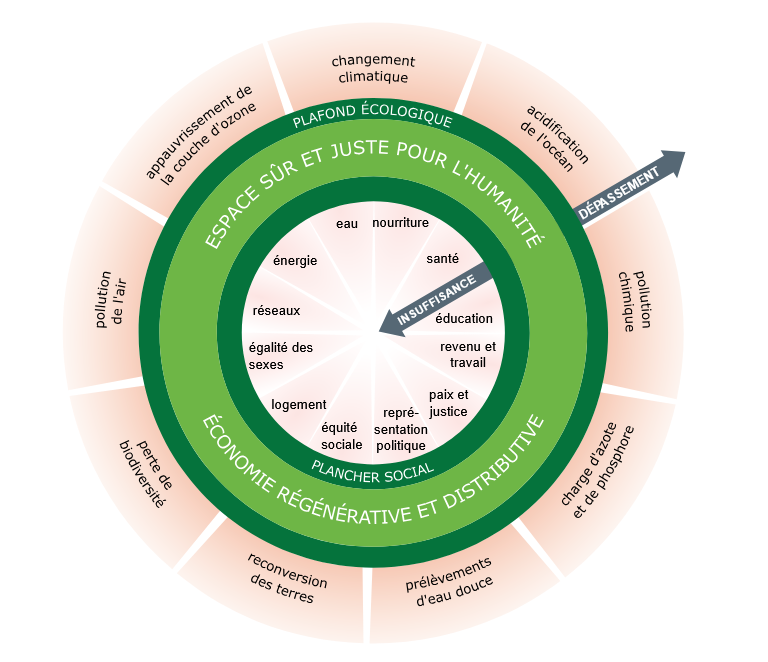 La journée a commencé par un constat : la crise écologique actuelle (effondrement de la biodiversité, raréfaction des ressources, crise climatique) rend indispensable une refonte complète de nos modèles de production et de consommation (cf. le Circularity Gap Report 2024). Pour les organisations, la transformation écologique n’est pas une option, mais une stratégie de résilience et de durabilité. Pour cela, le modèle de la « Théorie du Donut » de Kate Raworth (graphique ci-dessous) a été pris en exemple : naviguer les 12 limites planétaires en garantissant le plancher social pour tous sans dépasser le plafond environnemental.